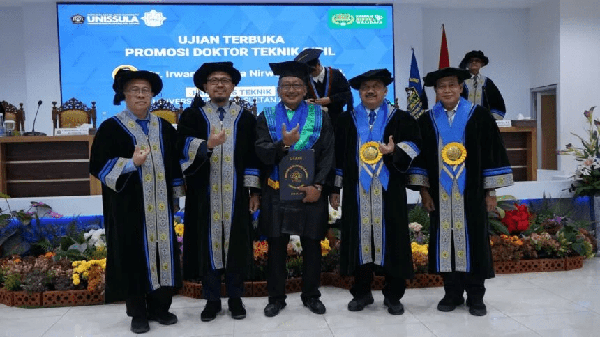 Irwan Chandra Nirwana ST MM berhasil meraih gelar doktor dari Program Doktor Teknik Sipil (PDTS) Unissula. Ia lulus dalam ujian terbuka yang dihelat di aula Fakultas Teknik pada Jumat (28/11/2025).